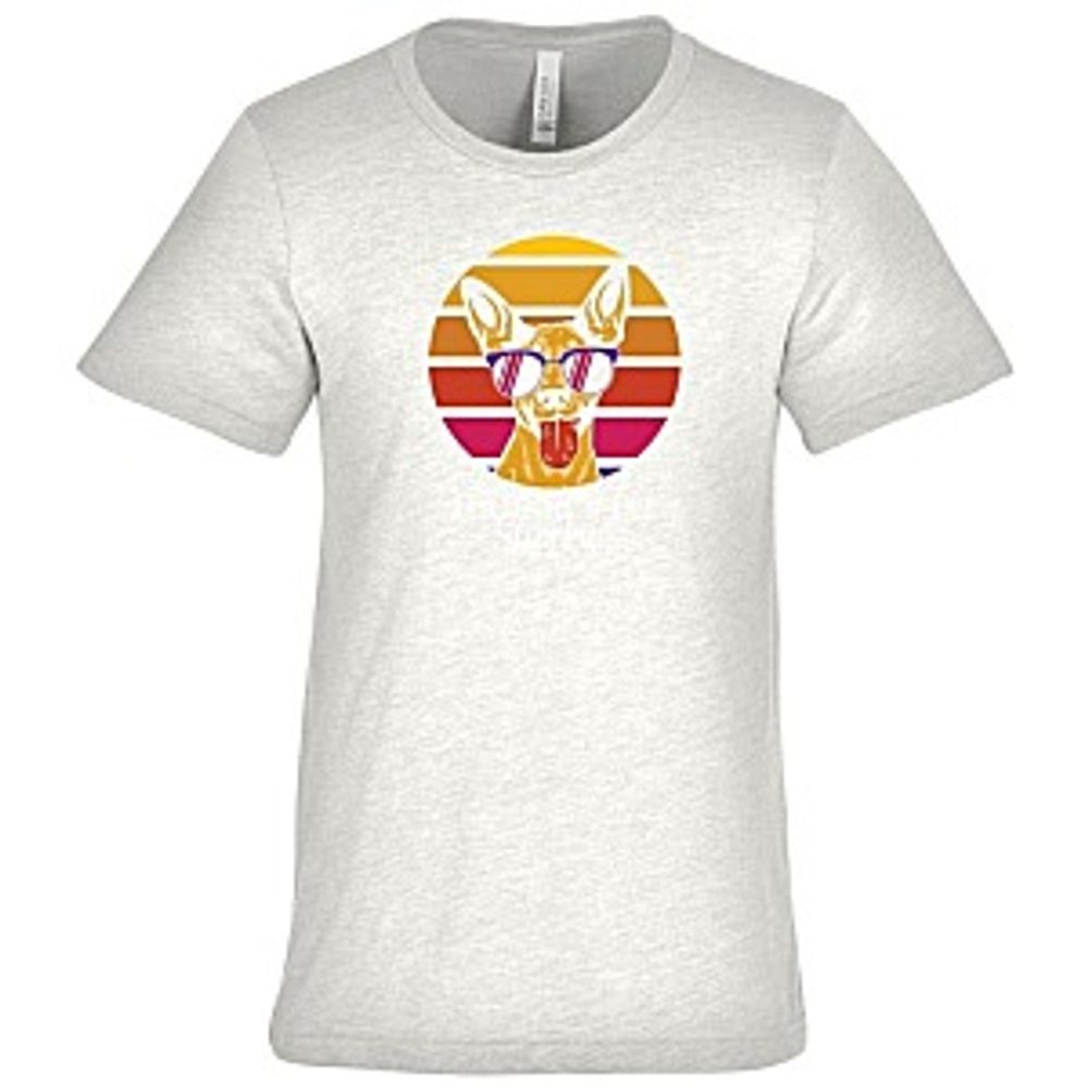 This Bella+Canvas® tee is made of 3.8-oz, 50/25/25 polyester/cotton/rayon material. The tri-blend fabric is super soft, lightweight and designed with a rib-knit crewneck collar and short set-in sleeves.